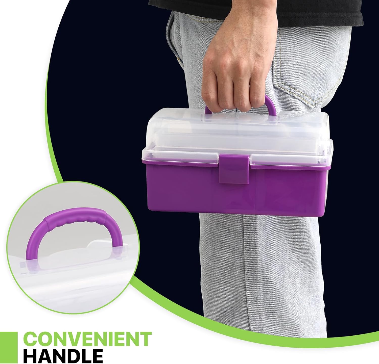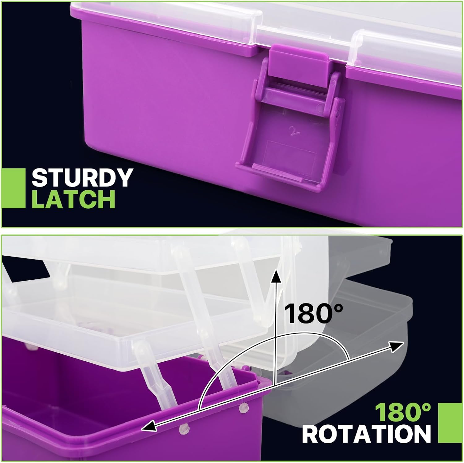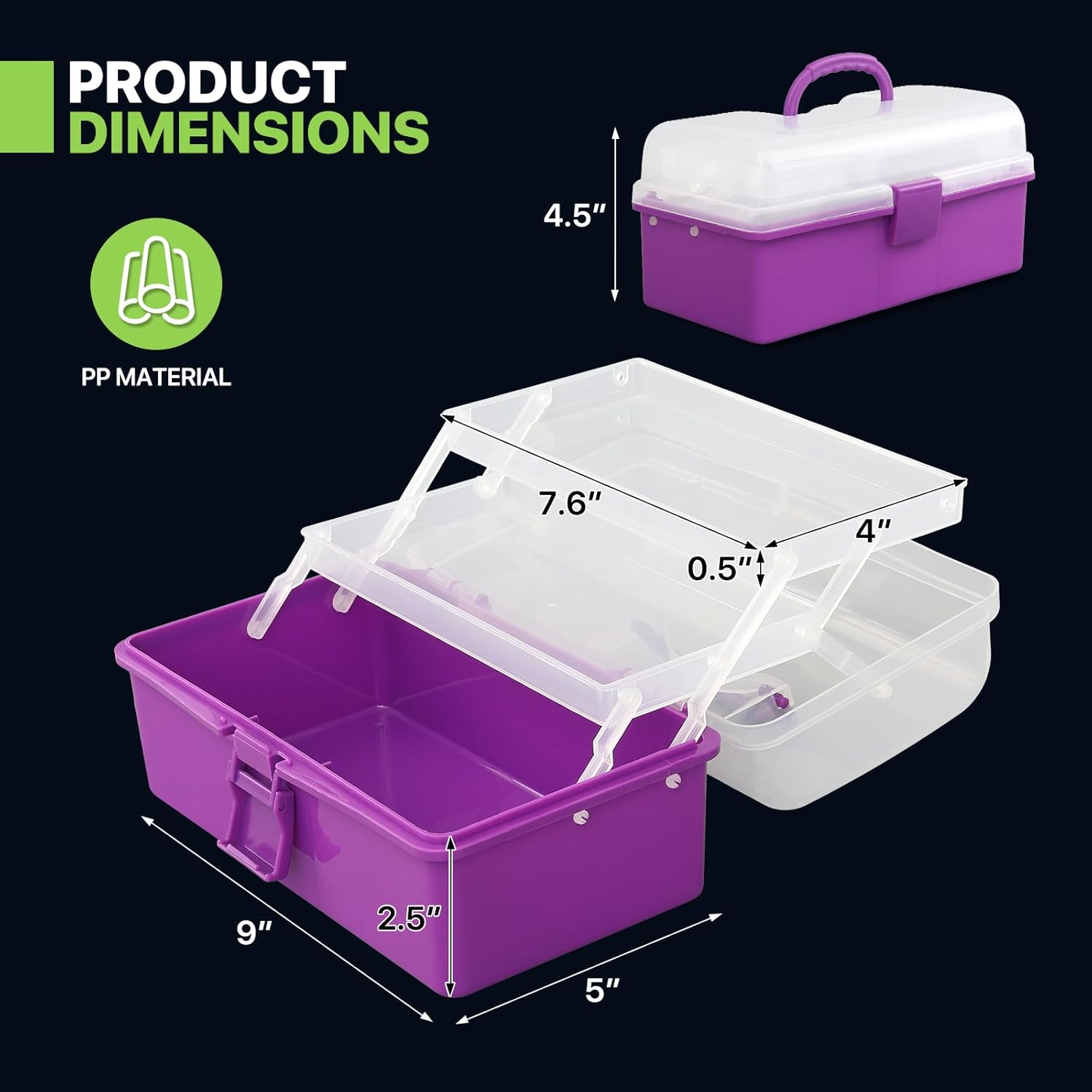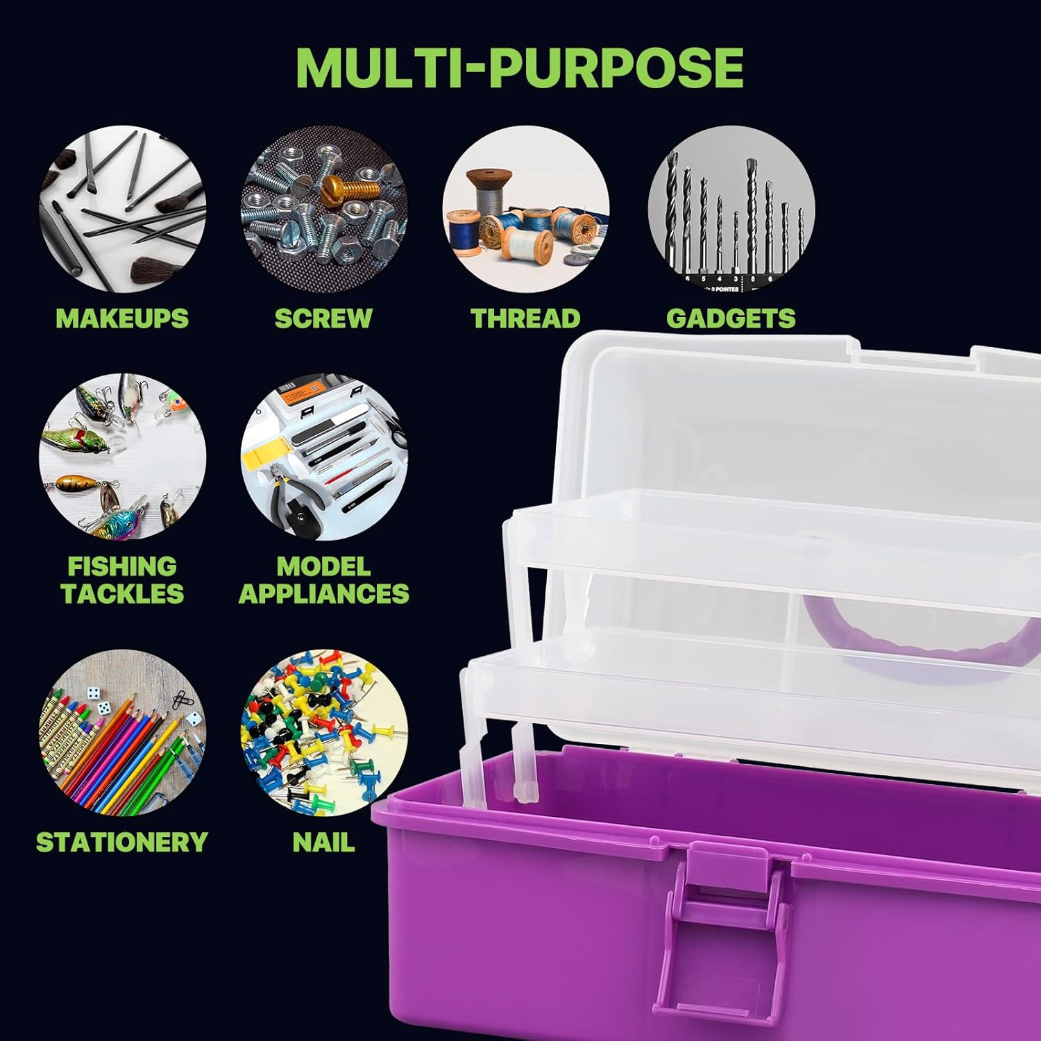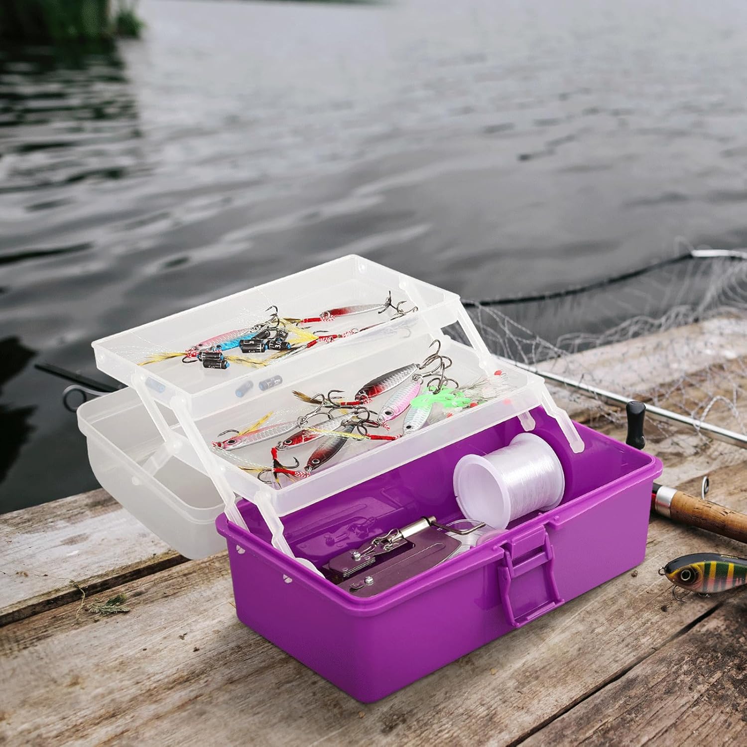 Magshion 3-Layer Fishing Tackle Box with Snap Latches, 9 Inch Multi-Purpose Plastic Storage Organizer, Folding Tool Box with Trays for Makeup, Stationery, Gadgets, Durable & Portable, Purple